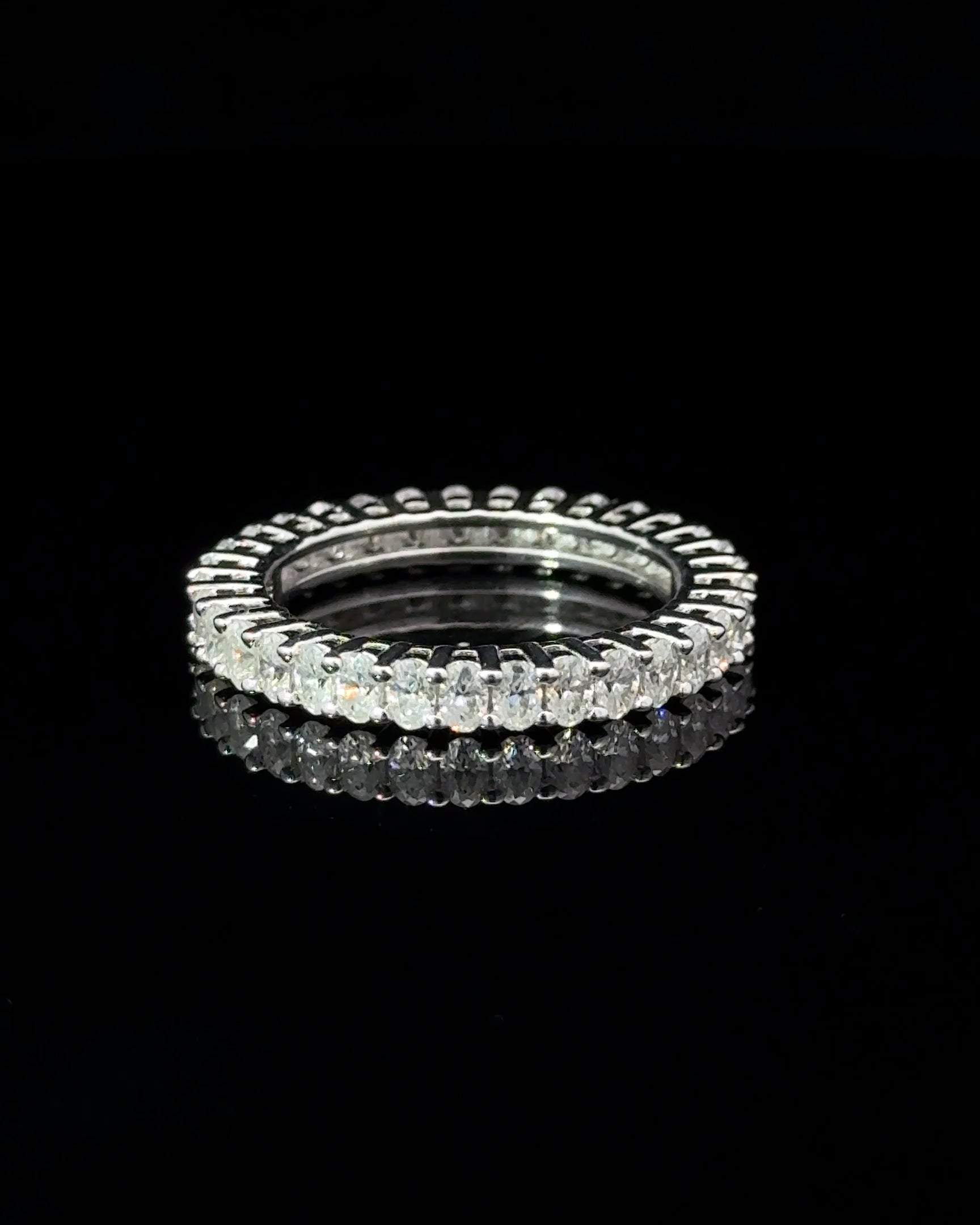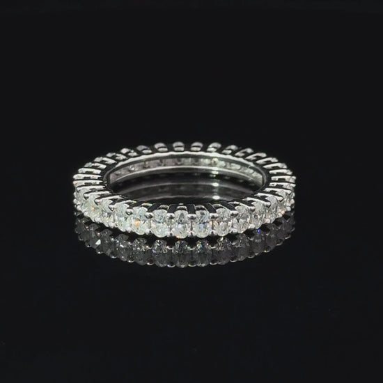 This timeless eternity band is crafted in sterling silver and set with a continuous row of 3x2mm oval-cut moissanite stones for maximum brilliance and fire. Perfect as a wedding band, anniversary ring, or stacked with other pieces, it offers the luxurious look of diamonds at a fraction of the price.